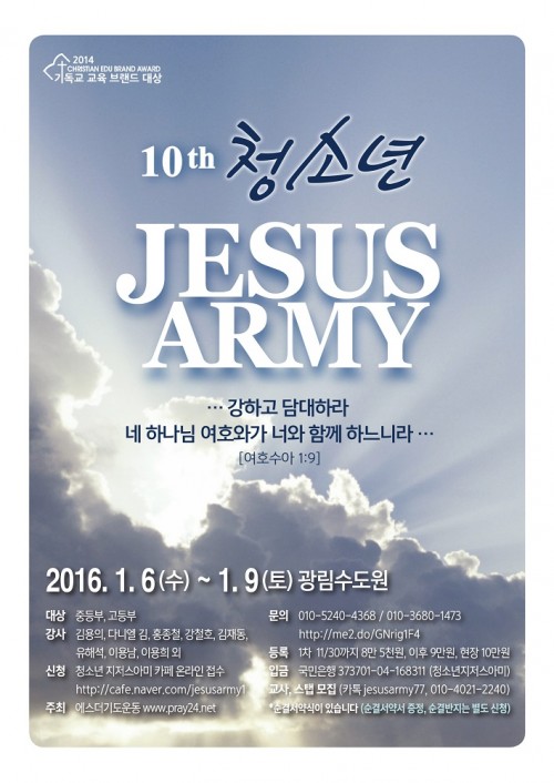 청소년 최고의 집회로 인정받은 ‘2016 제10차 청소년 지저스아미(Jesus Army)’ 수련회가 한국 교회의 많은 청소년들의 관심속에 개최된다.