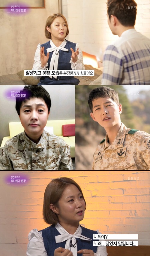 박나래는 분장에 대한 부담감을 드러내며 "잘생기고 예쁜건 분장으로 표현하기 힘들더라. 그걸 깬 게 송중기 분장이다. 왠지 닮았더라. 댓글들도 '왜 닮았지?'라고 하더라"며 송중기 분장에 대한 뿌듯함을 드러냈다.