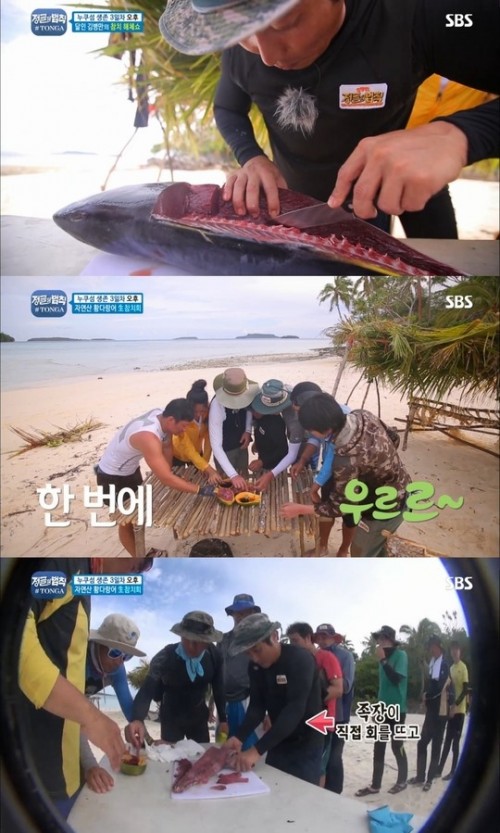 이날 '정글의 법칙'에서는 김병만은 고대하던 참치 해체쇼를 선보였다. 참치 해체용 칼이 있을 턱 없는 정글에서 무딘 가정용 칼로 거대한 참치를 완벽하게 손질해냈다. 병만족은 물론 함께 고생한 스태프들까지 40여 명이 생 참치회 파티를 즐겼다.