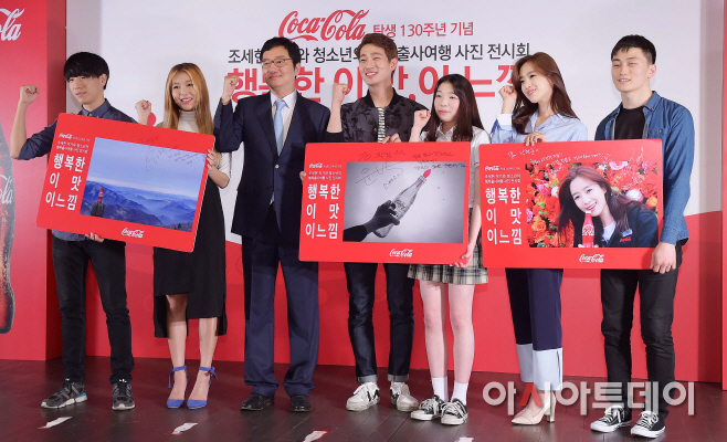 원더걸스 유빈,조세현,윤박,티아라 은정과 학생들이 11일 오전 서울 종로구 관훈동 가나인사아트센타에서 열린 코카-콜라 탄생 130주년 기념 '행복한 이 맛, 이 느낌!' 사진 전시회 오픈 기념 행사에 참석해 포토타임을 갖고 있다.