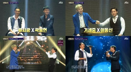 △ 기세중·이동신 VS 류지광·곽동현첫 번째 대결은 기세중·이동신 팀과 류지광·곽동현 팀이 맞붙었다. 기세중과 이동신은 뮤지컬 ‘프랑켄슈타인’ 넘버 ‘너의 꿈속에서’를 불렀으며 류지광과 곽동현은 어그레이트빅월드의 ‘Say Something’을 선곡했다.