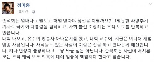 정미홍 전 아나운서는 3일 자신의 SNS에 "손석희는 얼마나 고발되고 처벌받아야 정신을 차릴까요? 그럴듯한 짜 맞추기 기사로 국가와 대통령을 폄하하고, 사회 불신 조장하는 조작 보도를 반복하고 있습니다"라고 주장했다.