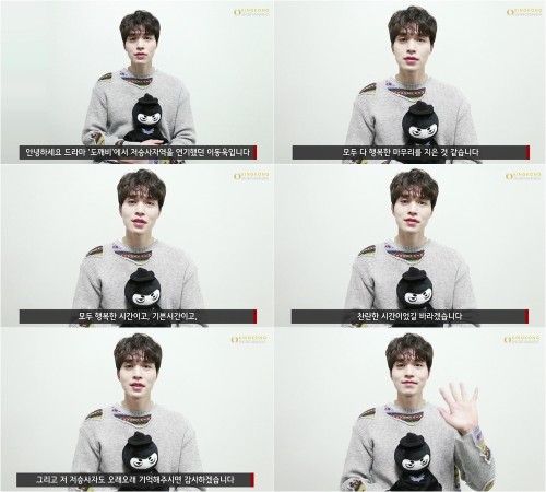이동욱은 ‘도깨비’에서 맡았던 역할인 저승사자 인형을 품에 꼭 안은 채 “드라마 ‘도깨비’에서 저승사자 역을 연기했던 배우 이동욱입니다”라고 인사를 건넸다. 이어 “드라마의 장르가 판타지였고, CG라든지 액션이라든지 여러 가지 면에서 시간이 많이 필요한 장면들이 많았는데요. 워낙 배우들끼리도 사이가 좋았고, 스태프들과 배우들의 사이도 좋아서 웃으면서 잘 마무리할 수 있었습니다”라고 전했다.