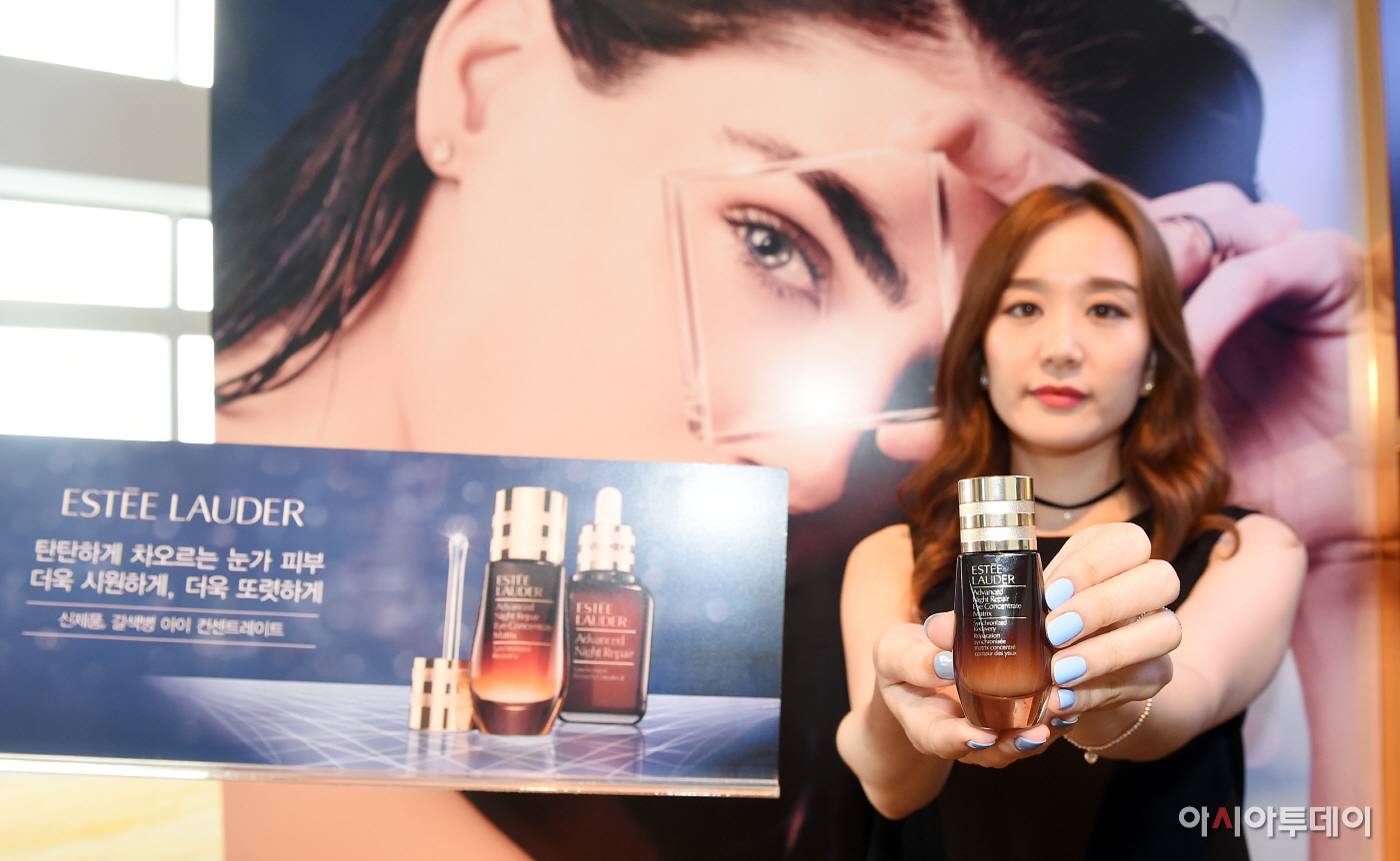 뷰티 브랜드 에스티로더가 8일 오후 송파구 시그니엘 서울 그랜드볼륨에서 신제품 어드밴스드 나이트 리페어 컨센트레이트 매트릭스 (갈색병 아이 에센스 크림)를 론칭하고 도우미가 제품을 선보이고 있다.