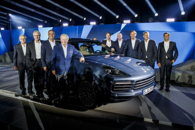 지난 29일 슈투트가르트 주펜하우젠에서 열린 신형 카이엔 공개 행사에 참석한 우베 카르스텐 슈테터(왼쪽부터) 포르쉐 AG 생산 이사회 멤버와 알버트 레이몰드 포르쉐 AG 생산 이사회 멤버, 닥터 볼프강 포르쉐 포르쉐 감독 이사회 의장, 루츠 메쉬커 포르쉐 AG 파이낸스 및 IT 이사회 멤버, 우베 휙 포르쉐 그룹 직원 평의회 대표 우베, 올리버 블루메 포르쉐 AG 이사회 회장, 데틀레브 본 플라텐 포르쉐 AG 영업 및 마케팅 이사회 멤버, 닥터 마이클 슈타이너 포르쉐 신형 카이엔 R&D 이사회 멤버 등이 기념 촬영을 하고 있다./제공 = 포르쉐