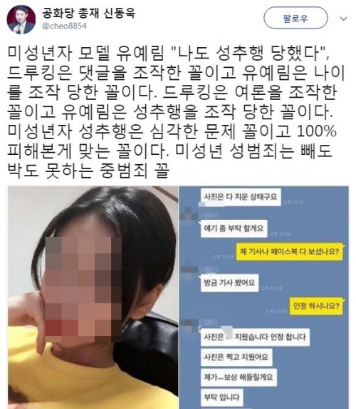 신 총재는 19일 트위터에 "드루킹은 댓글을 조작한 꼴이고 유예림은 나이를 조작 당한 꼴이다. 드루킹은 여론을 조작한 꼴이고 유예림은 성추행을 조작 당한 꼴이다. 미성년자 성추행은 심각한 문제 꼴이고 100% 피해본게 맞는 꼴이다. 미성년 성범죄는 빼도 박도 못하는 중범죄 꼴"이라는 글을 게시했다.