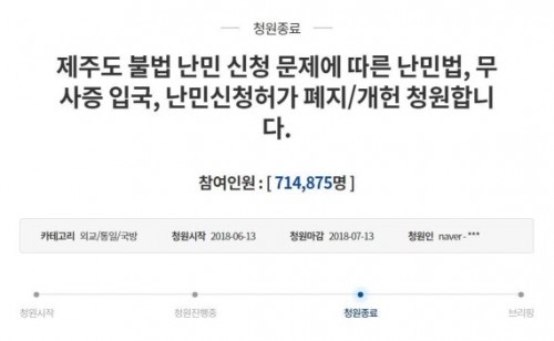 한편 1일 박상기 법무부 장관은 난민법 폐지를 주장하는 청와대 국민청원에 대해 “이번 청원에 나타난 국민들의 우려를 무겁게 받아들이고 있다. 우리나라 국제적 위상과 국익에 미치는 문제점을 고려할 때 난민협약 탈퇴나 난민법 폐지는 현실적으로 어려움이 있다"고 답했다.