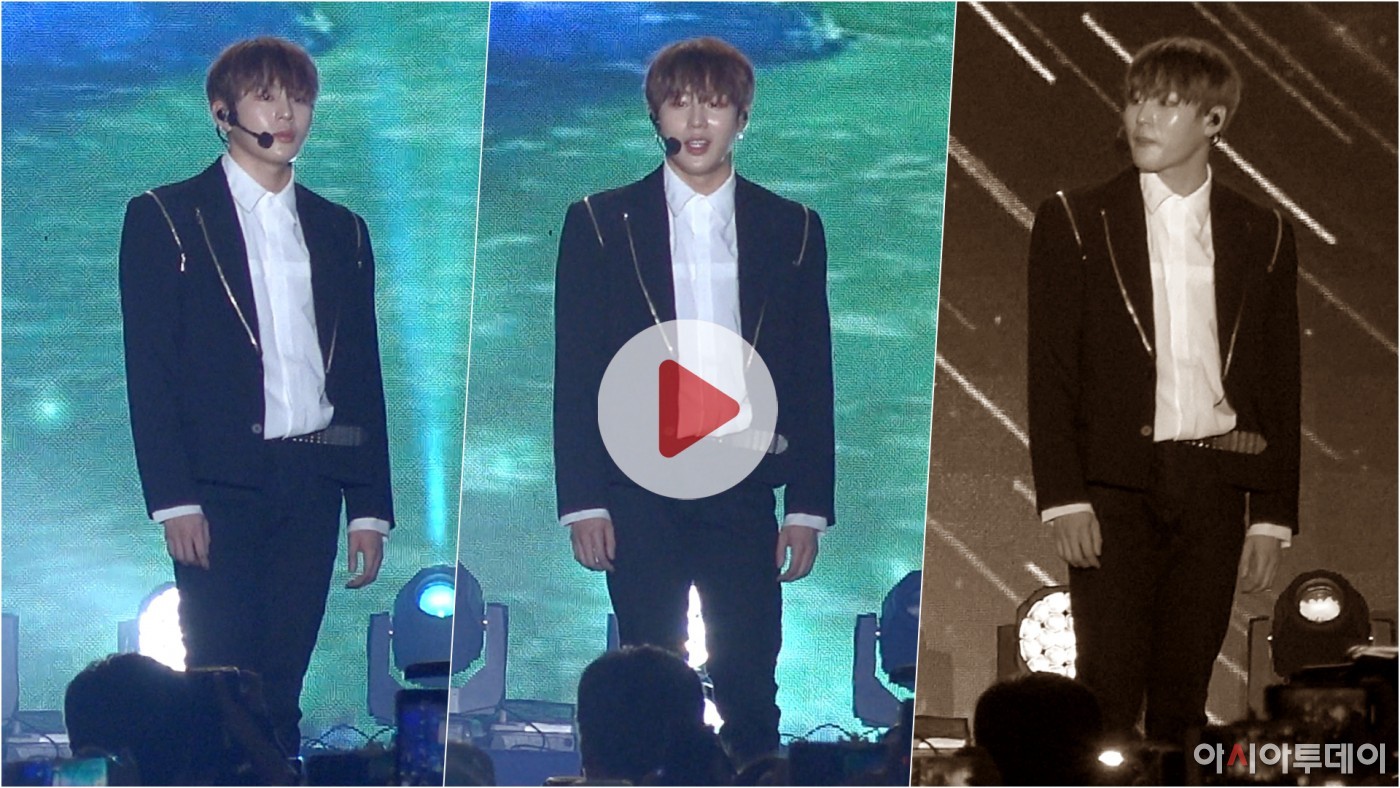 이날 콘서트에 참석한 워너원(강다니엘, 박지훈, 이대휘, 김재환, 옹성우, 박우진, 라이관린, 윤지성, 황민현, 배진영, 하성운)이 '너의 이름을' 무대를 선보이고 있다.