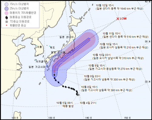 태풍 돌핀은 오는 9일 오후 3시 일본 가고시마 동남동쪽 약 270km 부근 해상을 지나 10일 오후 3시 일본 오사카 남동쪽 약 210km 부근 해상으로 진출할 것으로 예상된다.