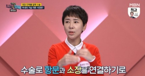 한아름은 “병원을 가기 2주 전 혈변을 봤다"며 "검진 결과 가족성 선종성 용종증을 진단받았다. 대장 전체를 제거하고 항문에 소장 끝을 연결하기로 햇다. 근데 제가 소장이 너무 작았다. 그래서 배 밖으로 빼서 인공항문인 장루를 달았다”고 밝혔다.