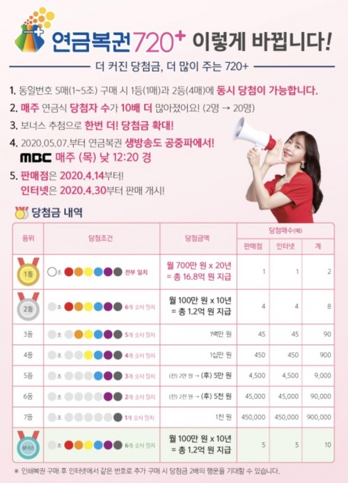 한편 연금복권720+ 1등 당첨금은 매월 700만원씩 20년간 연금 형식으로 지급되며 세금을 뗀 실수령액은 546만원 정도다.