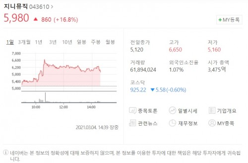 지니뮤직은 4일 오후 2시 39분 기준 전 거래일 대비 860원(16.8%) 오른 5980원에 거래되고 있다.