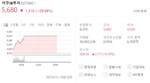 아주IB투자는 15일 오후 2시 8분 기준 전 거래일 대비 1310원(29.98%) 오른 5680원에 거래되고 있다.