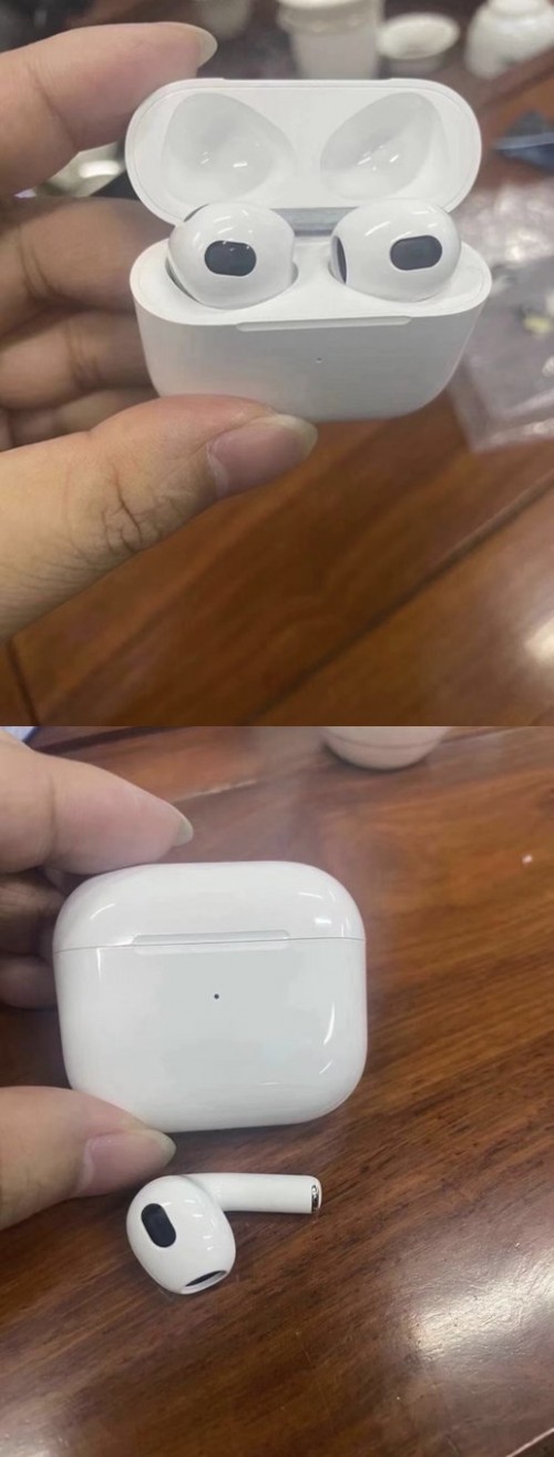 공개된 사진을 보면 에어팟 3세대는 콩나물을 연상시키는 에어팟 1세대와 2세대에 비해 길이가 확연히 짧아졌다. 에어팟 프로에 달린 실리콘 이어팁도 없어졌다.