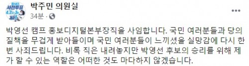 1일 박주민 의원은 자신의 페이스북에 글을 올리고 "박영선 캠프 홍보디지털본부장직을 사임한다"며 "국민 여러분들과 당의 질책을 무겁게 받아들이며 국민 여러분들이 느끼셨을 실망감에 다시 한번 사죄드린다"고 고개를 숙였다.