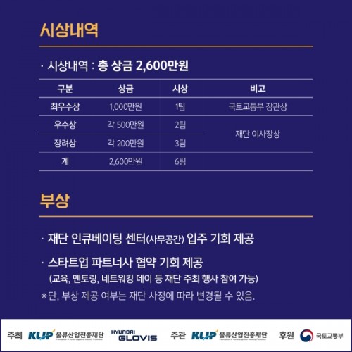 물류 분야의 창업자를 발굴하고 육성하기 위한 물류 스타트업 경진대회는 창의적인 아이디어를 갖춘 물류 분야 스타트업을 발굴하기 위해 매년 개최되는 행사로 총상금은 2,600만 원이다.