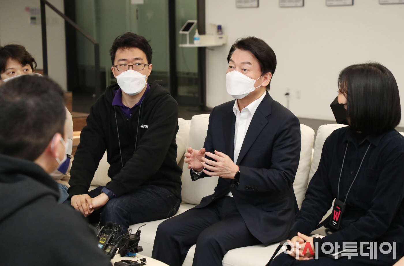 안철수 국민의당 대선후보가 12일 인터넷을 통해 방송영상과 영화를 공급하는 국내의 대표적인 OTT 플랫폼 기업인 서울 강남의 왓챠 본사를 방문해 박태훈 왓챠 대표 및 직원들과 대화하고 있다.<국회사진취재단>