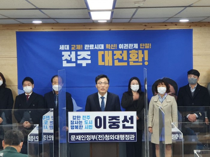 이중선 전 청와대 행정관이 지난 13일 전주시청 브리핑룸에서 기자회견을 열고 내년 지방선거에 전주시장 출마를 공식 선언하고 있다.
