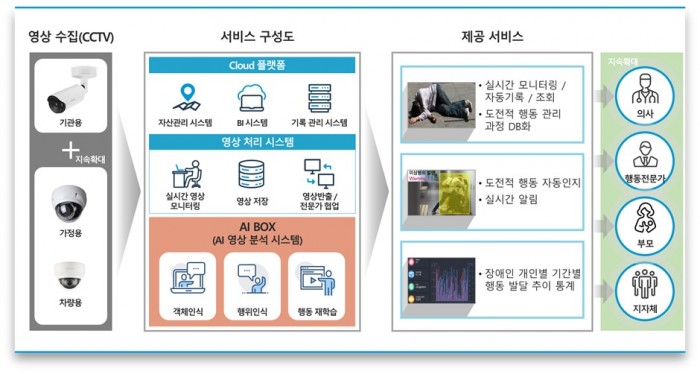 이번에 개발한 ‘AI 지능형 영상분석 솔루션’은 발달 장애인의 자해, 타해, 상동행위 등의 이상 행동을 AI 기술이 인식하고, 그 행동 패턴을 수치화해 통계 기반 교정‧교육‧치료 행위를 지원한다. 또한 클라우드 서비스를 활용해 위험 상황에 대해 발달장애인 보호자 및 관리자에게 정보가 제공되며, 향후 사건, 사고의 예방을 위한 데이터 분석 서비스도 제공한다.