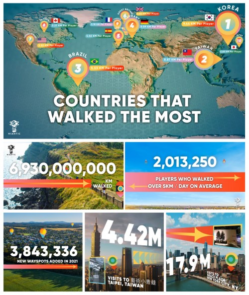 이번 ‘Niantic Recap 2021’은 한눈에 확인할 수 있는 인포그래픽 형식으로 발표됐으며, 올 한 해 동안 Niantic의 게임에서 전 세계 플레이어들이 함께 이룩한 걷기 거리, 신규 추가된 웨이스팟 수 등의 기록을 담았다.