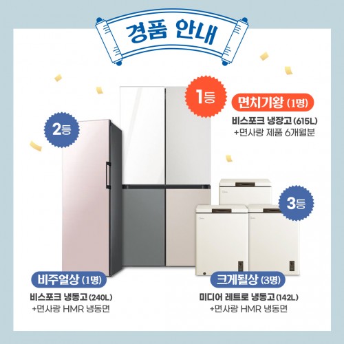 최종 선발된 면치기왕에겐 면 애호가들의 필수 아이템인 삼성 비스포크 4도어 냉장고(1명)와 6개월 분의 면사랑 HMR 냉동면을 제공하고, 창의성과 인기도(좋아요 수)에 따라 선정된 2등과 3등에게는 각각 삼성 비스포크 냉동고(1명), 미디어 레트로 냉동고(3명)안에 면사랑 HMR 냉동면을 가득 채워준다.