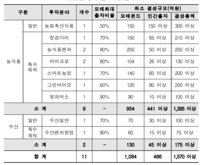 또한 기존에 투자한 농식품경영체의 성장에 따른 추가 자금조달을 지원하는 징검다리펀드, 새로운 기술과 비즈니스모델을 가진 농식품경영체에 투자하는 농식품벤처펀드, 1차농산업을 영위하는 청년농업인에게 투자하는 영파머스펀드, 창업초기 농식품경영체에 집중 투자하는 마이크로펀드 등을 조성할 예정이다.