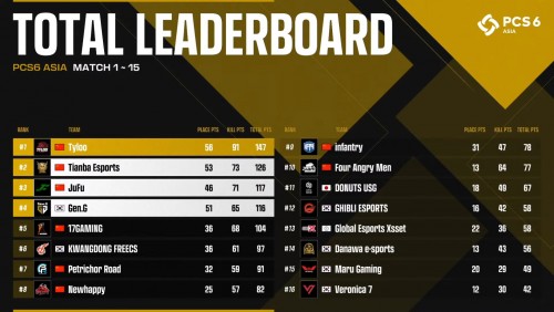 2위와 3위도 중국 팀이 이름을 올렸다. 중국의 Tianba Esports가 126포인트로 2위, JuFu가 117포인트를 기록하며 3위를 차지했다.