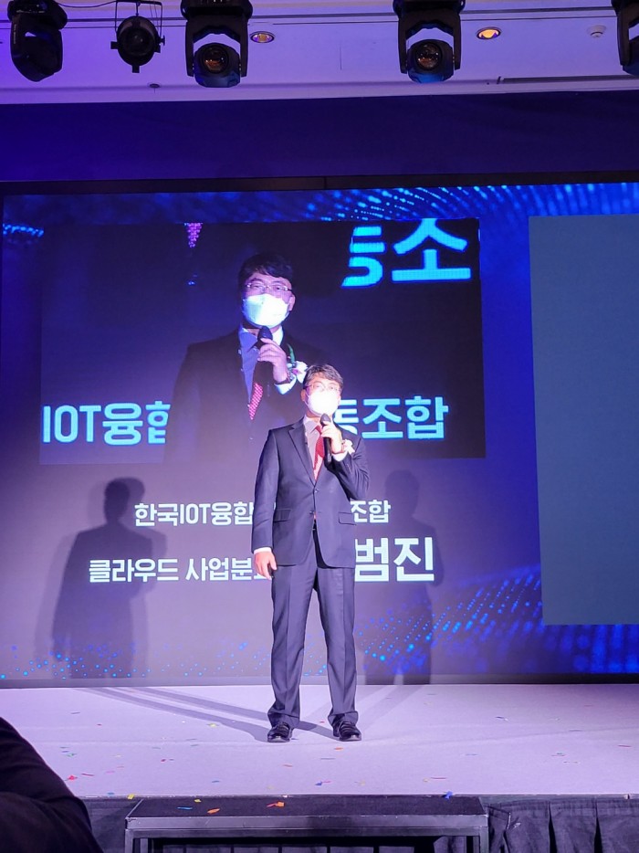| 30일 개최된 ‘공공 클라우드 민간이양 선포식’에서 김범진 한국IoT융합사업협동조합 클라우드 사업 분과장(타이거컴퍼니 대표)이 비전발표를 하고 있다. /사진=한국IoT융합사업협동조합 |