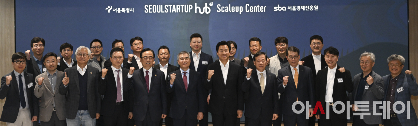 오세훈 서울시장을 비롯한 참석자들이 27일 오후 서울 역삼동 한국과학기술회관에서 열린 서울창업허브 스케일업센터 개관식에서 기념 촬영을 하고 있다.