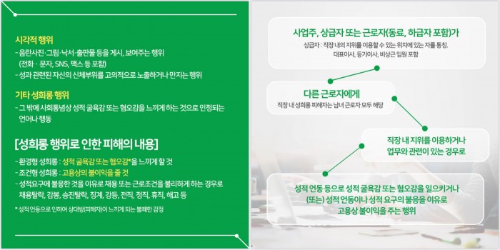 그가 올린 안내문 중 '직장 내 성희롱의 판단 기준'에는 ▲ 입맞춤, 포옹 또는 뒤에서 껴안는 등 신체적 접촉 ▲ 가슴·엉덩이 등 특정 신체 부위를 만지는 행위 ▲ 안마나 애무를 강요하는 행위 ▲ 음란한 농담, 음탕하고 상스러운 이야기를 하는 행위 ▲ 외모를 평가하거나 성적으로 비유하거나 신체 부위를 언급하는 행위 ▲ 성적인 사실관계를 묻거나 성적인 내용의 정보를 의도적으로 퍼뜨리는 행위 ▲ 성적인 관계를 강요하거나 회유하는 행위 ▲ 회식 자리 등에서 무리하게 옆에 앉혀 술을 따르도록 강요하는 행위 등이 포함된다.