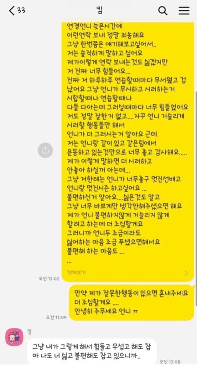이다영은 지난 18일부터 김연경(흥국생명)과 주고받은 메시지를 공개하고, 그에 대한 저격을 이어가고 있다. 공개된 내용에 따르면 김연경은 이다영의 긴 메시지에 "그냥 내가 그렇게 해서 힘들고 무섭고 해도 참아. 나도 너 싫고 불편해도 참고 있으니까"라며 단 두 마디로 짧게 답했다.
