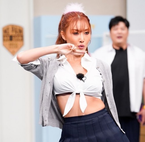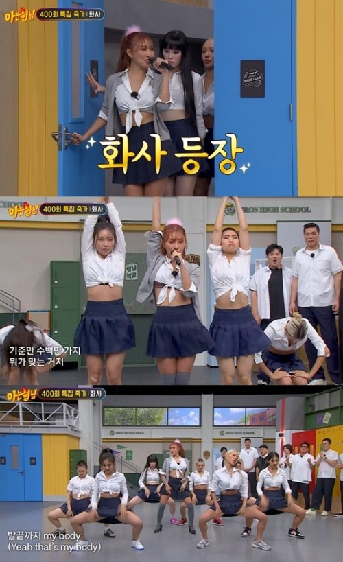 화사는 ‘아는 형님’ 컨셉에 맞게 교복을 자신만의 스타일로 리폼해 몸매를 강조, 복부를 드러내고 셔츠 밑단을 묶어서 브라톱처럼 연출했다.