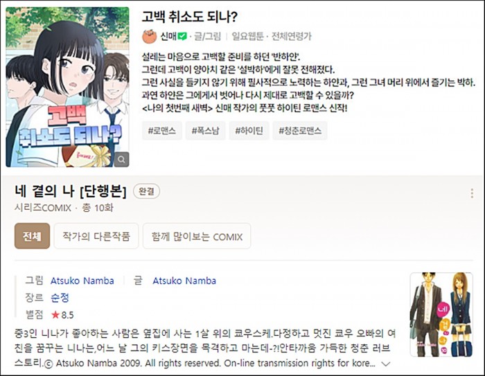 | 네이버 웹툰 '고백 취소도 되나?' 정보 (위), 일본 만화 '네 곁의 나' 정보 (아래) / 네이버 |