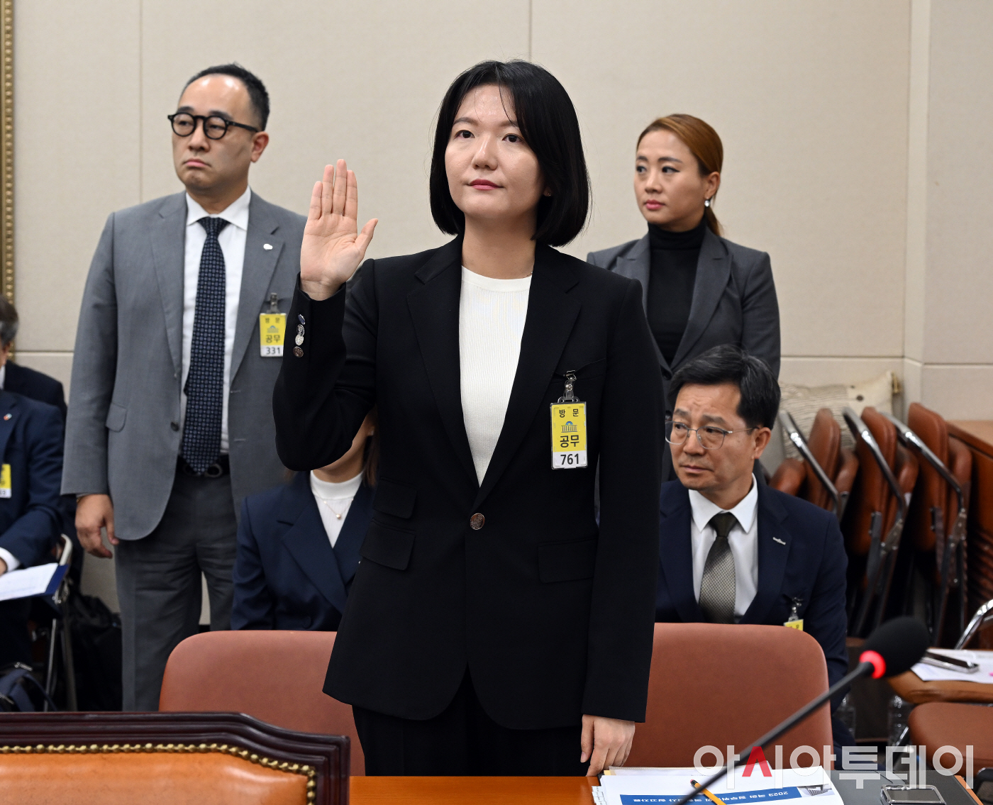최수연 네이버 대표이사가 26일 국회에서 열린 정무위원회의 국가보훈부·국무조정실·국무총리비서실·공정거래위원회·국민권익위원회·개인정보보호위원회에 대한 종합감사에서 증인으로 출석해 선서를 하고 있다. /송의주 기자
