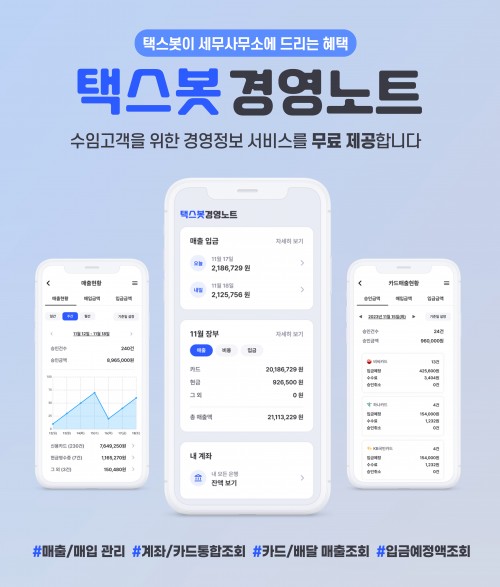 택스봇 경영노트는 국내 최초로 세무사들이 수임고객들에게 경영 정보를 제공할 수 있도록 만든 서비스로 은행, 카드, 홈택스, 여신금융협회의 매출과 매입 정보를 실시간으로 조회 가능하다.