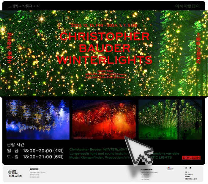 또 빛에 반응하는 음향이 한데 어우러져 전시를 체험하는 30분간 신비로운 크리스마스 숲을 거니는 기분을 느낄 수 있다.