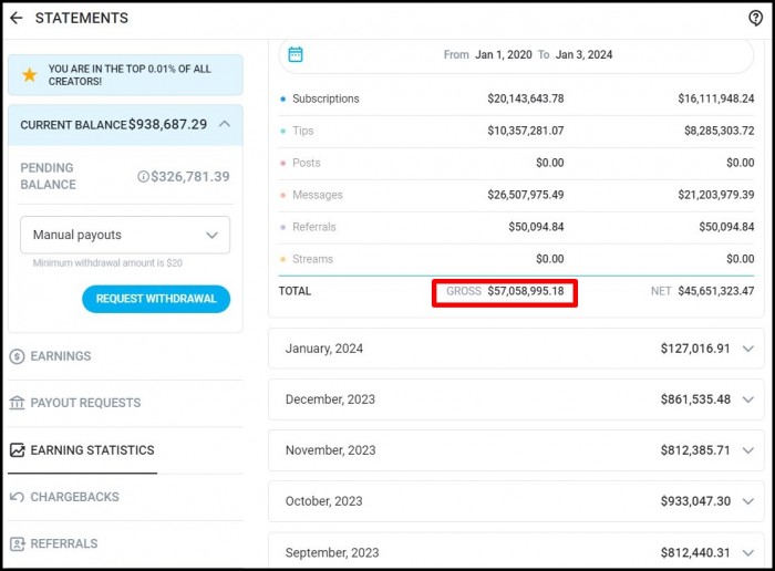 공개한 내역에 따르면 2020년 1월부터 2024년 1월까지 온리 팬즈로만 거둔 수익금은 약 5700만 달러, 한화 약 753억으로 확인됐다. 특히 2023년 9월부터 12월까지는 매달 100만 달러 가까이 수익을 냈다.