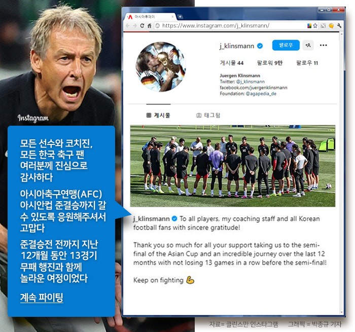 해당 글에는 대표팀이 한 데 모인 사진도 올라왔다. 클린스만 감독은 이어 "아시아축구연맹(AFC) 아시안컵 준결승까지 갈 수 있도록 응원해주셔서 고맙다"며 "준결승전 전까지 지난 12개월 동안 13경기 무패 행진과 함께 놀라운 여정이었다"고 덧붙였다.