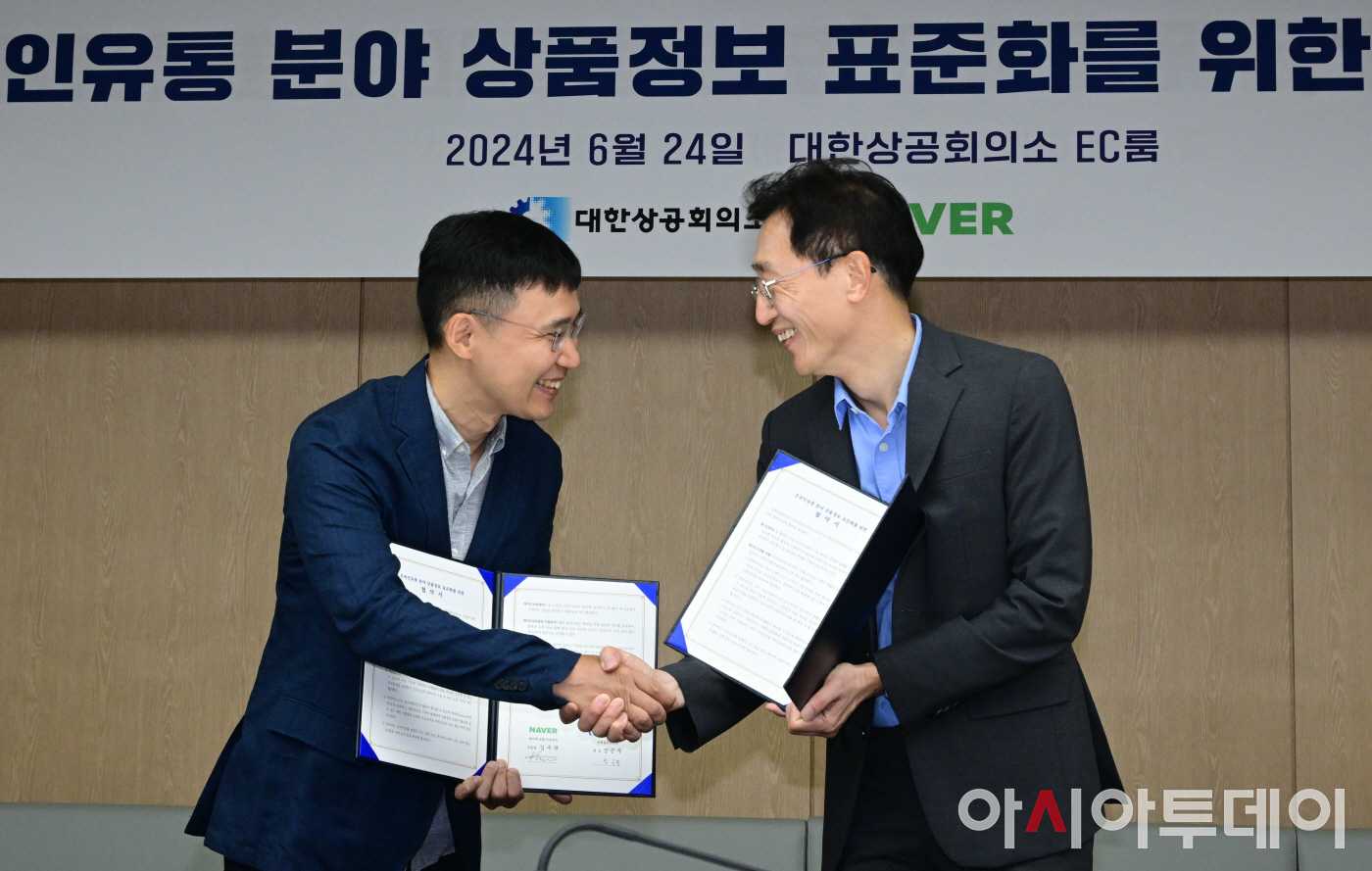 24일 오전 서울 중구 대한상공회의소 EC룸에서 장근무(오른쪽) 대한상공회의소 유통물류진흥원장과 김주관 네이버 쇼핑 프로덕트 부문장이 ‘온라인 유통 분야 상품정보 표준화’를 위한 업무협약(MOU)을 체결하고 있다.