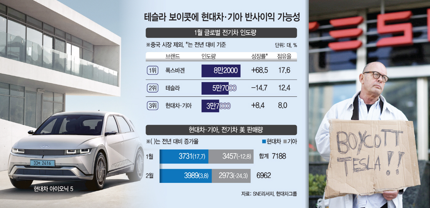 실제로 SNE리서치에 따르면 '테슬라 보이콧' 흐름이 온전히 반영되진 않았지만, 이미 지난 1월 테슬라의 중국 제외 글로벌 인도량은 5만 7000대로 전년 대비 14.7% 감소했다. 반면 폭스바겐그룹이 68.5% 성장하며 1위 자리를 차지했고, 현대차와 기아도 8.4% 증가한 3만 7000대를 기록했다. 미국 시장에서도 현대차는 1~2월 각각 3731대, 3989대를 판매하며 전년 동기 대비 각각 17.7%, 3.8% 증가하는 등 견조한 성장세를 보였다.