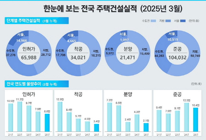 다만 3월 기준으로는 서울 등 수도권(1만5145가구) 인허가가 전월 대비 45.3% 증가했다. 서울(7339가구)이 376.2%, 인천(329가구)이 174.2% 각각 늘어난 점이 영향을 미쳤다. 경기(7477가구)는 2월 보다 14.7% 인허가 물량이 줄었다.