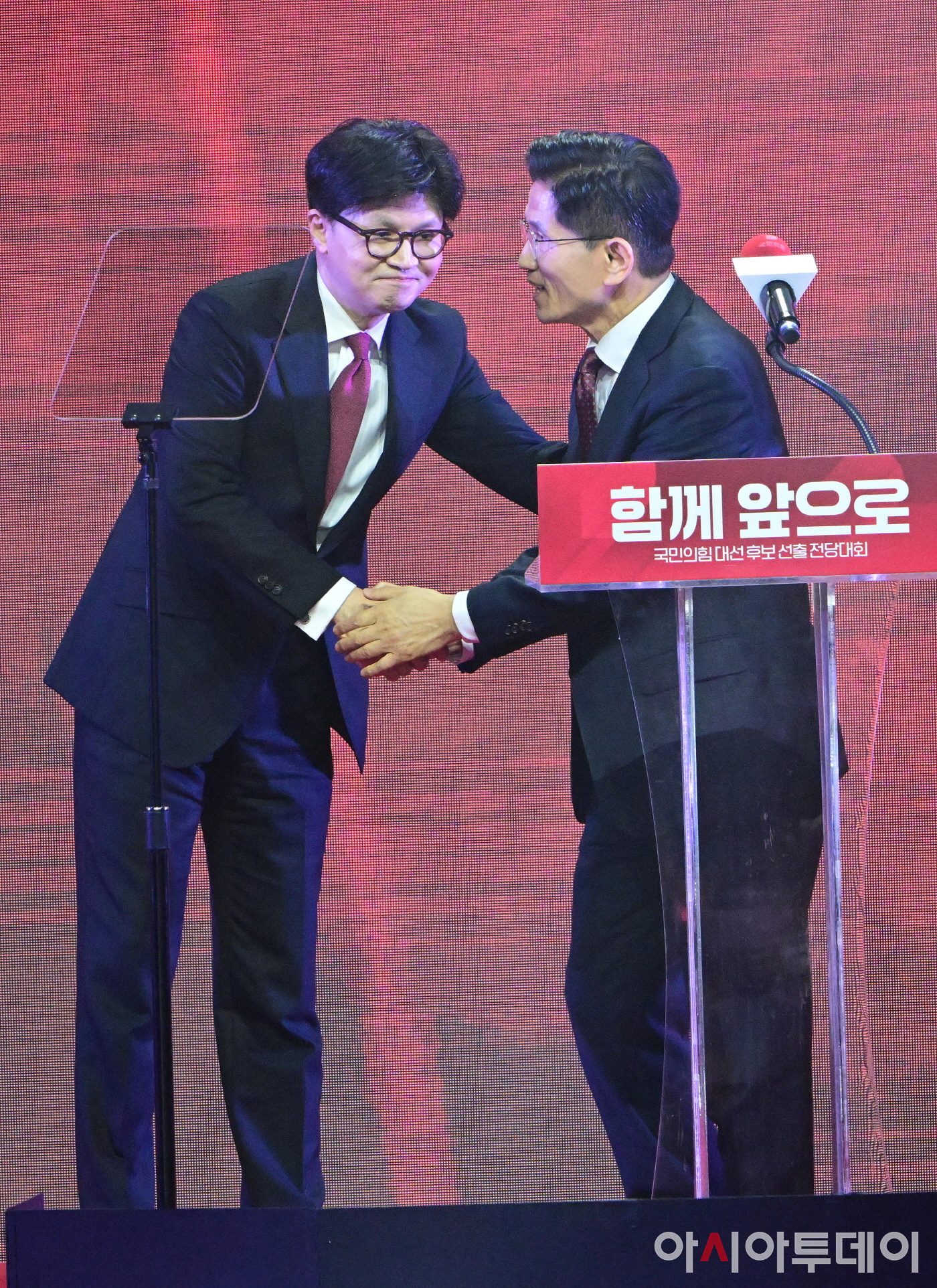 제21대 대통령선거 국민의힘 후보자로 선출된 김문수 후보가 3일 오후 경기 고양시 킨텍스에서 열린 5차 전당대회에서 최종 후보로 확정된 뒤 한동훈 대선 경선 후보와 악수하고 있다.