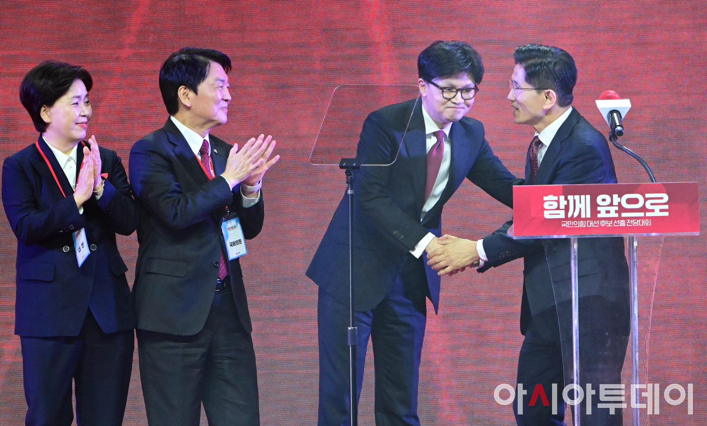 제21대 대통령선거 국민의힘 후보자로 선출된 김문수 후보가 3일 오후 경기 고양시 킨텍스에서 열린 5차 전당대회에서 최종 후보로 확정된 뒤 한동훈 대선 경선 후보와 악수하고 있다.
