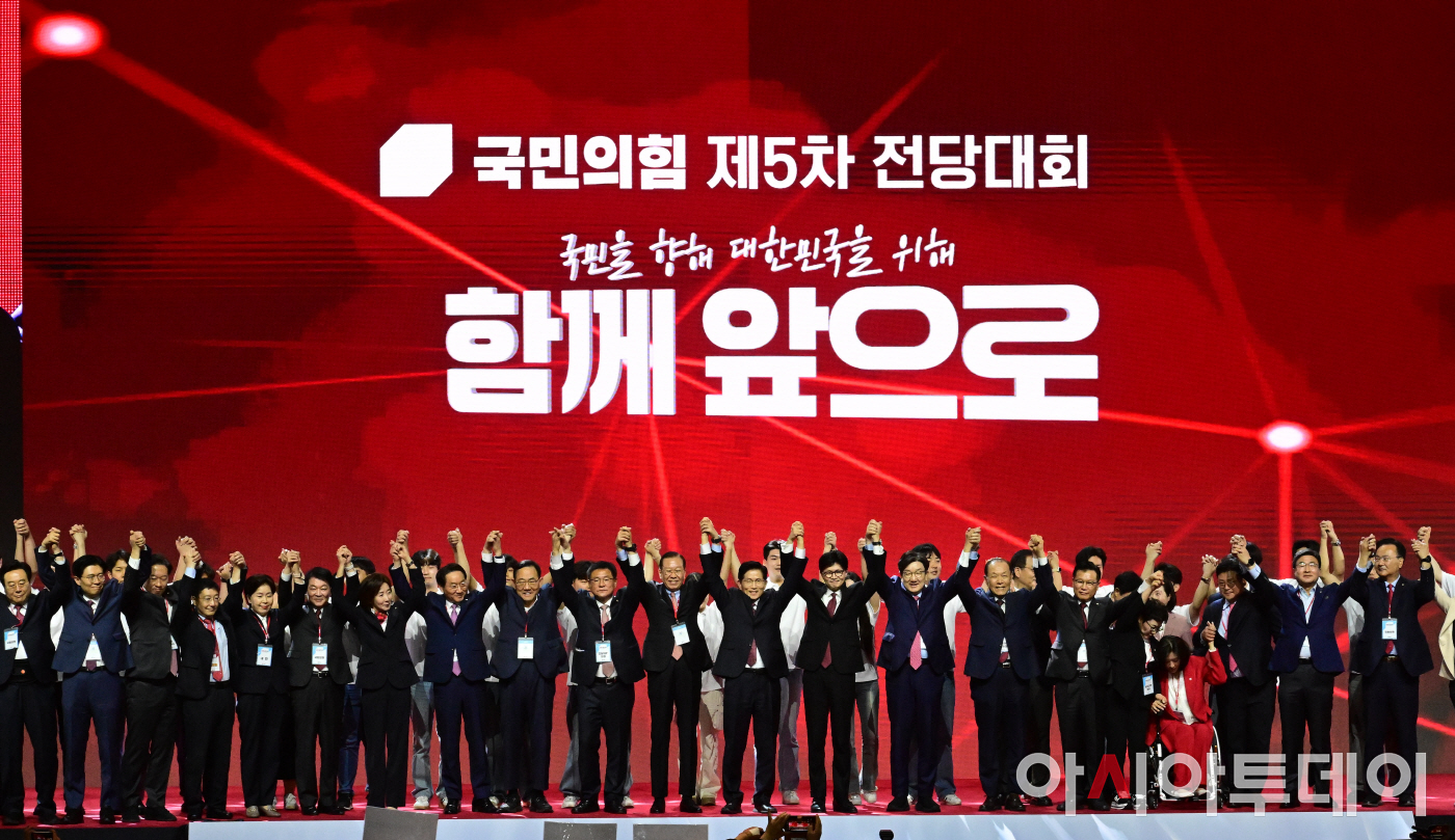 제21대 대통령선거 국민의힘 후보자로 선출된 김문수 후보가 3일 경기 고양시 킨텍스에서 열린 5차 전당대회에서 수락 연설을 마친 뒤 당지도부 및 주요 당직자들과 손을 맞잡아 들어보이며 인사하고 있다.