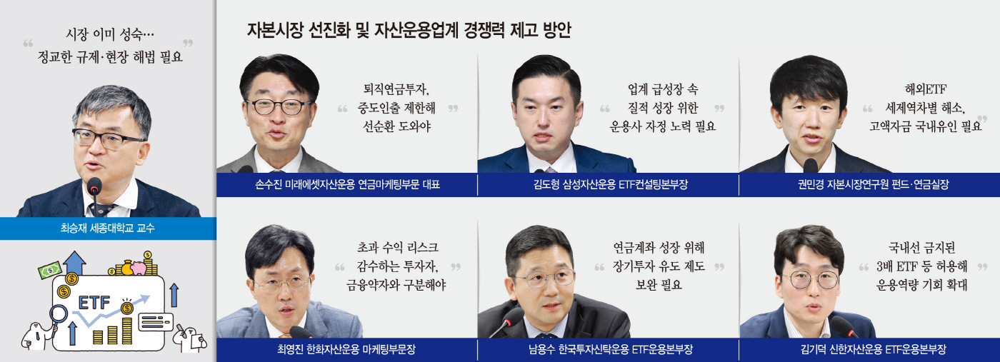 다만 제도개선에 앞서 운용사가 자정 노력을 통해 질적 성장을 꾀하고 시장의 신뢰를 구축해야 한다는 데 의견이 모였다. 특정 ETF에 대한 쏠림 현상을 경계하고, 전문성을 살린 경쟁력 있는 상품을 통해 투자자 니즈는 물론 수익률까지 고려해야 한다는 것이다. 또 공격적인 경쟁 구도를 지양하고 투자자들의 성향에 맞는 투자수단과 방식 등 방향성을 제시하는 등 건전하고 성숙한 투자문화 구축을 위해 업계가 앞장서야 한다는 점에도 함께 공감했다.