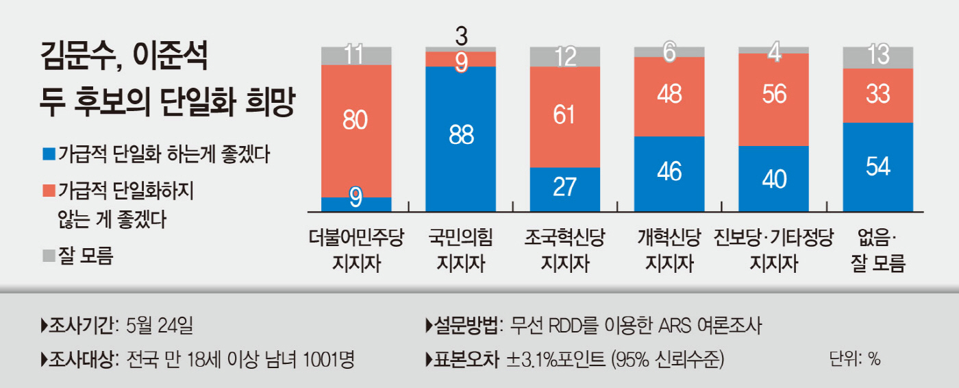 25일 '김문수-이준석 두 후보의 단일화 희망' 조사에서 국민의힘 지지층의 88%가 '가급적 단일화하는 게 좋겠다'고 답했다는 여론조사 결과가 나왔다. 국민의힘 지지층의 9%는 '가급적 단일화하지 않는 게 좋겠다'고 답했다. 반면 더불어민주당 지지층의 80%는 '가급적 단일화하지 않는 게 좋겠다'고 응답했고, 9%는 '가급적 단일화하는 게 좋겠다'고 했다. 개혁신당 지지층의 46%는 단일화 찬성 입장에, 48%는 단일화 반대 입장을 나타냈다.