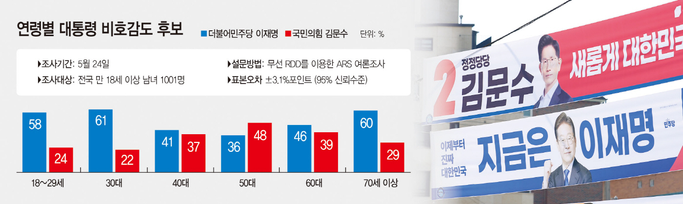 이 연령층에서는 20대(이재명 58%·김문수 24%), 30대(이재명 61%·김문수 22%), 70대(이재명 60%·김문수 29%)별로 이재명 후보에 대한 '대통령 비호감도'가 김문수 국민의힘 대통령 후보를 2배 이상 앞선 것으로 확인됐다.