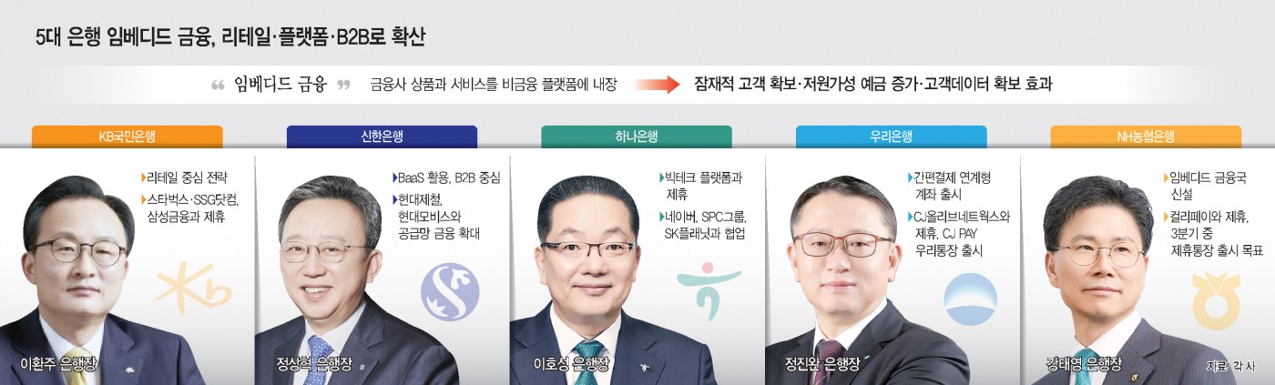 은행별로 임베디드 금융 차별화도 추진한다. 리테일과 빅테크 플랫폼, 간편결제 등 개인고객과 접점 극대화에 집중하는 전략을 내세우거나, B2B 중심 서비스를 통해 기업금융 등 비이자수익 강화에 초점을 맞추기도 한다.