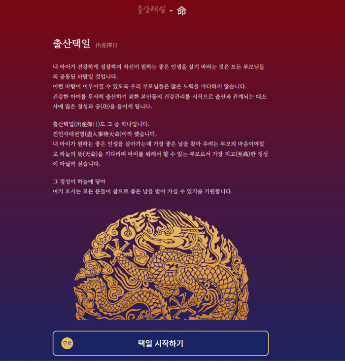출산 택일은 단순히 특정 날짜를 정하는 일이 아니다. 부모들은 자녀가 좋은 운명을 타고날 수 있기를 바라는 마음으로 신중하게 날짜와 시간을 선택한다. 애플리케이션 '명(命)'은 사주 명리학 전문가들이 사주팔자를 꼼꼼히 분석해 '성격(成格)'과 '운(運)'을 고루 갖춘 날짜를 추천한다.