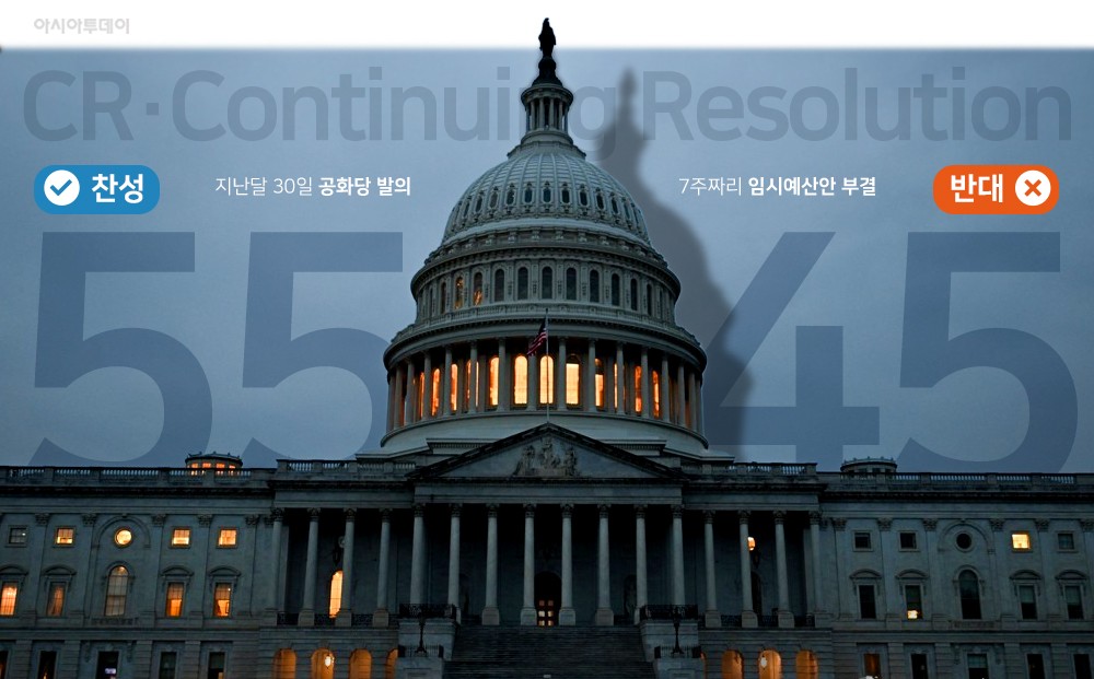 지난달 30일 공화당이 발의한 7주짜리 임시예산안(CR·Continuing Resolution)을 표결에 부쳤지만 찬성 55표, 반대 45표로 부결됐다. 연합/ 그래픽= 박종규 기자 |